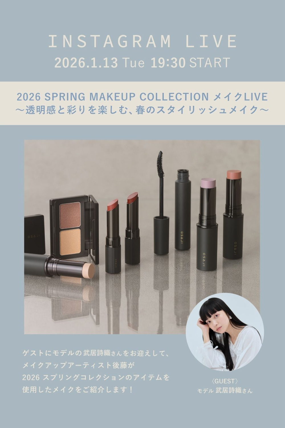武居詩織が、敏感肌コスメブランド・OSAJI のインスタライブに出演いたします。